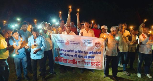 काशी हिंदू विश्वविद्यालय (BHU) में संविदा और दैनिक वेतनभोगी कर्मचारियों का स्थायीकरण को लेकर चल रहा अनिश्चितकालीन आंदोलन 8वें दिन भी जारी रहा। कर्मचारियों ने शांतिपूर्ण तरीके से कैंडल मार्च निकालकर अपनी मांगों को दोहराया और प्रशासन से न्याय की गुहार लगाई।