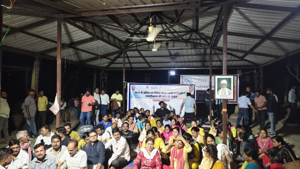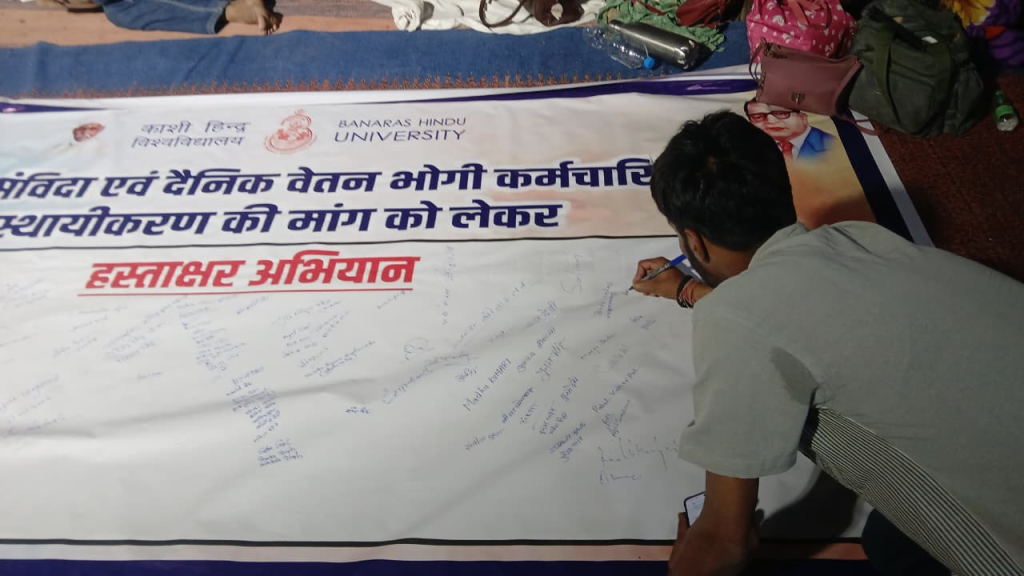 काशी हिंदू विश्वविद्यालय (BHU) में नियमितीकरण की मांग को लेकर कर्मचारियों का आंदोलन लगातार तेज होता जा रहा है। गुरुवार को मधुबन पार्क में चल रहा शांतिपूर्ण धरना 9वें दिन भी जारी रहा, जहां कर्मचारियों ने हस्ताक्षर अभियान चलाकर प्रशासन के खिलाफ अपना विरोध दर्ज कराया।